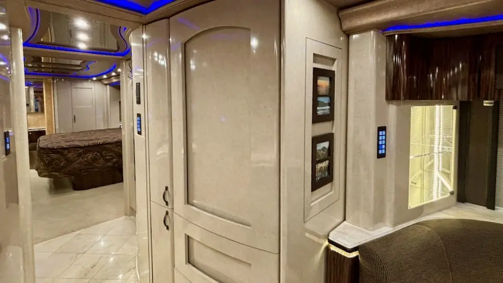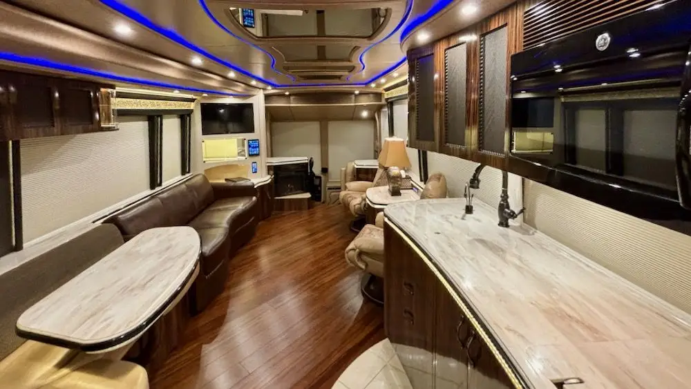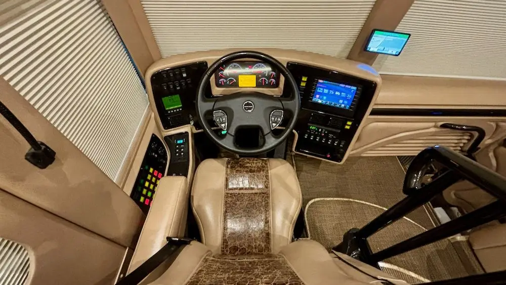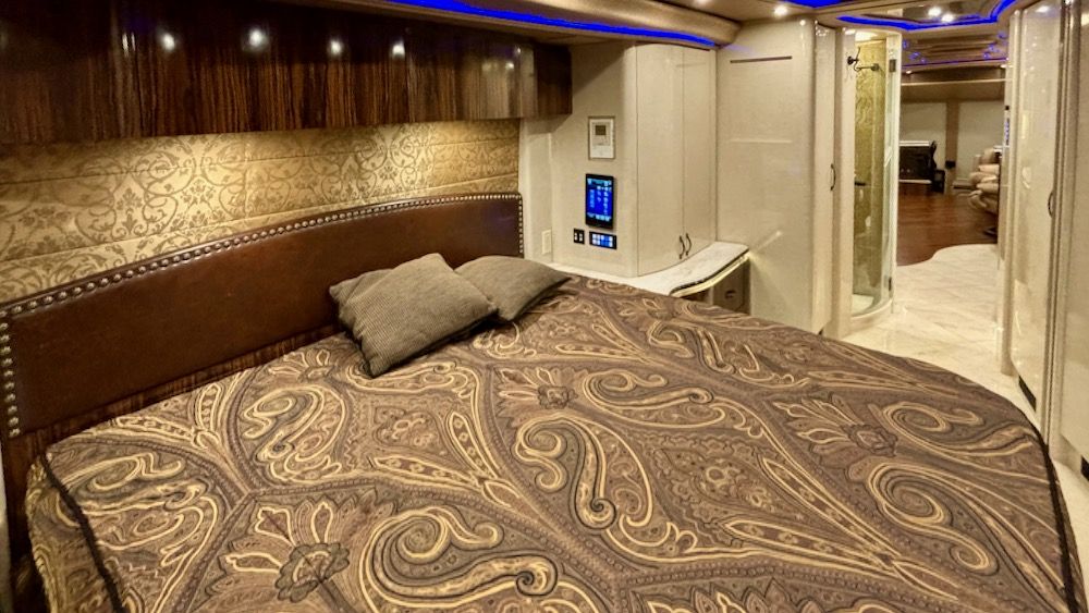 This fantastic coach features four roof A/C with heat pumps (recently installed), a 20KW turbo genset, large Xantrex inverters, the ability to run multiple A/C's off the inverters, IPad Crestron integration, and a built-in mobile hotspot with router.