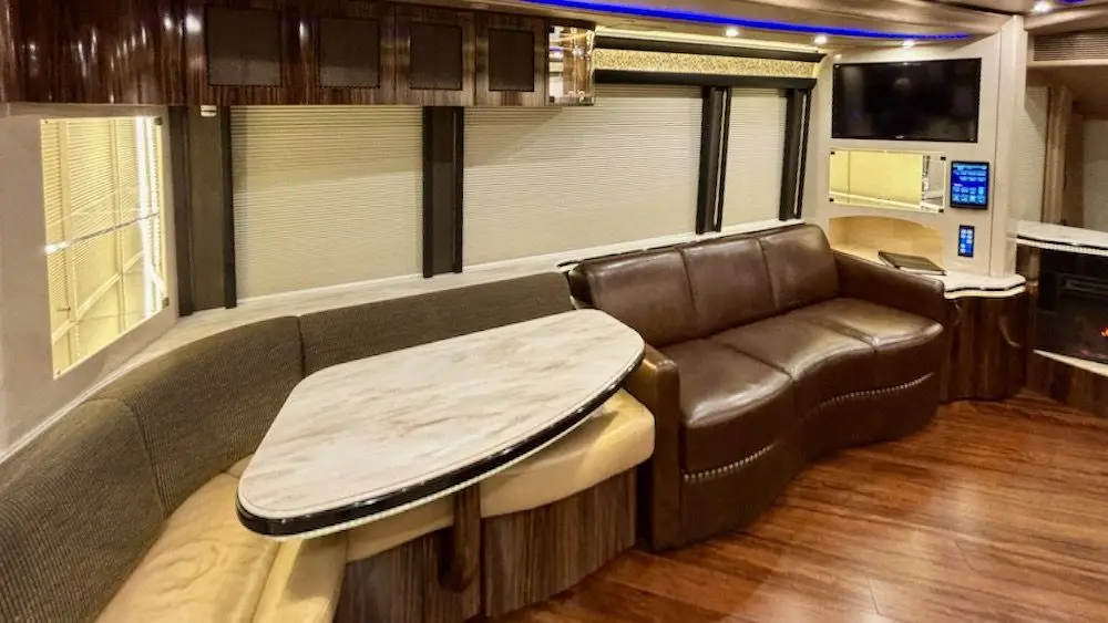 Featuring beautiful hardwood flooring in the salon, along with two Lafer recliners, a lounge dinette, a small occasional table with pull-out desk top, a swing-down forward TV, a large stationary slideroom TV, and a jack-knife sofa bed.