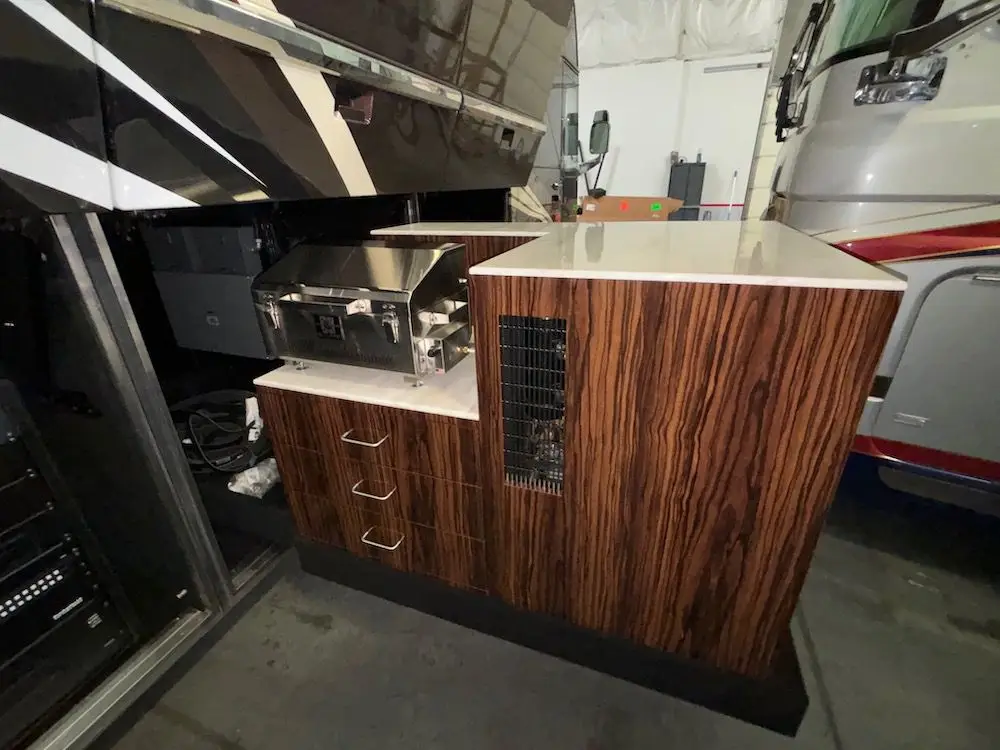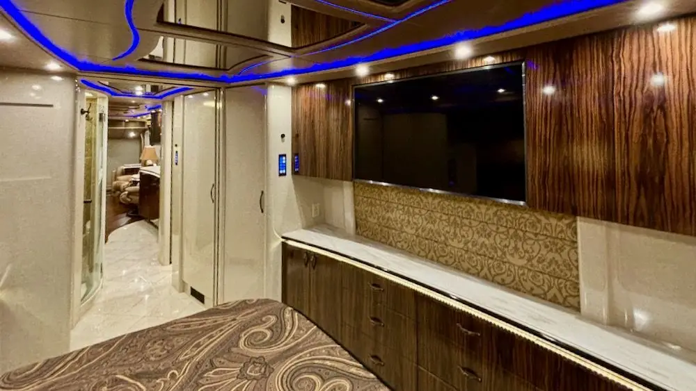 This pristine coach includes Prevost stability control, built in TPM, a 500HP D-13 Volvo powerplant, undercoach lighting, 4 roof top integrated awnings, power sliding tray with refrigerator, BBQ, and storage, outside smart TV, and so much more.