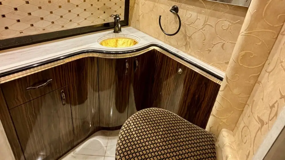 This bath & 1/2 floor plan includes a private head with vanity & small TV mid coach, large shower, aft lav with second vanity, to make getting ready for an evening out a breeze.