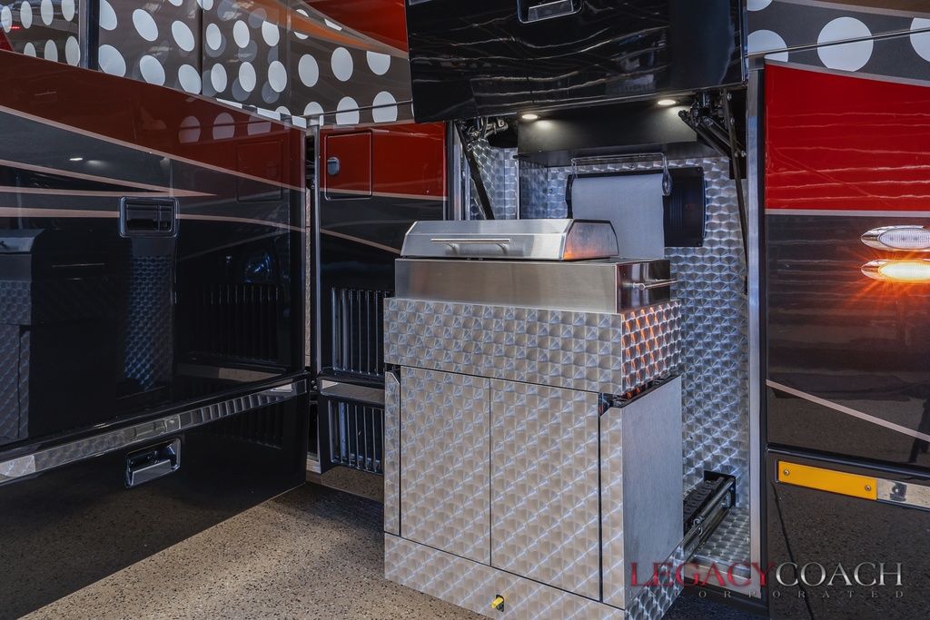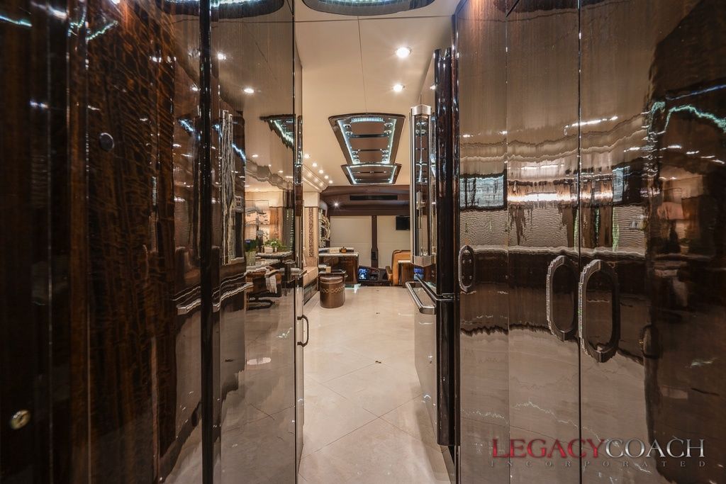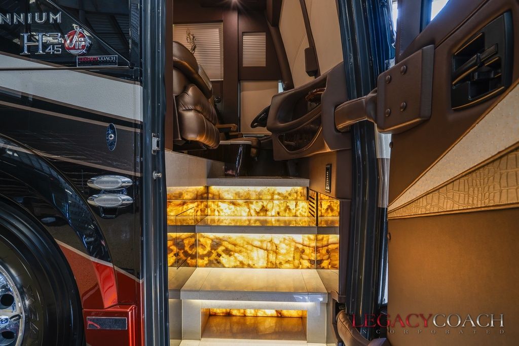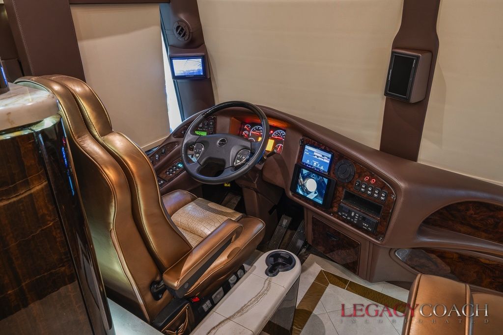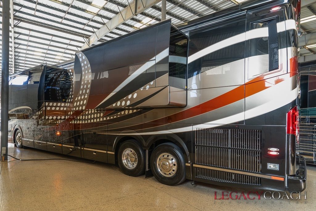 New arrival! This spectacular Millennium Quad Slide has to be seen fully to understand the level of care it’s received. This garaged coach shows “as new” from top to bottom and was serviced at Millennium Coach since new. Custom-built to exacting standards with many added features including multiple added storage areas, the finest finishes and fixtures, enlarged rear bath (vanity / shower) with open plan, mid-coach bath area lavatory (sink / toilet), heated floor throughout and so much more.