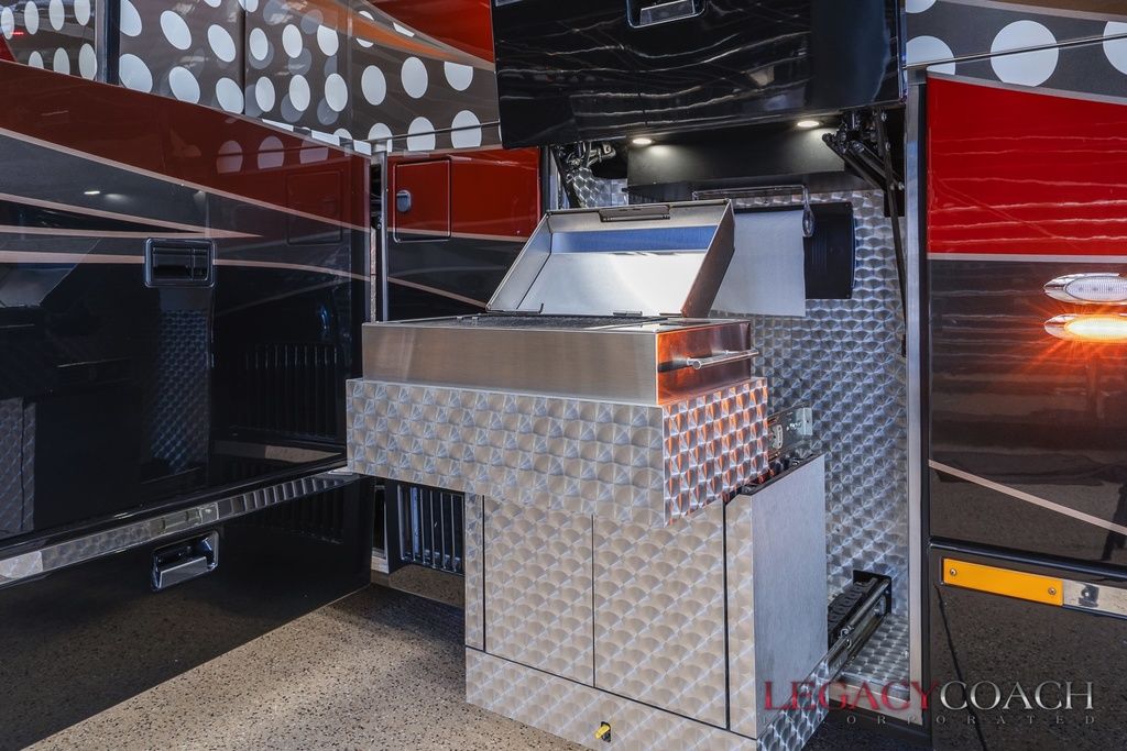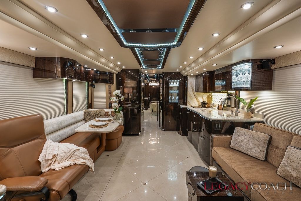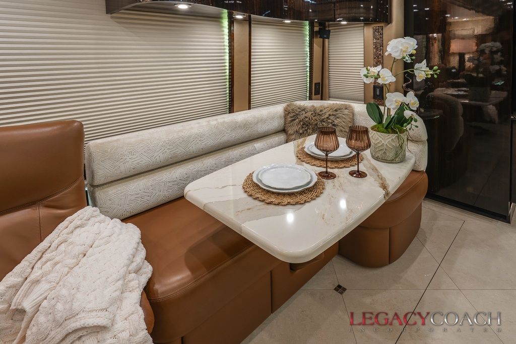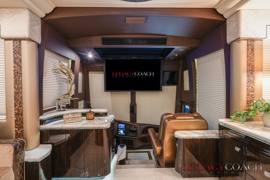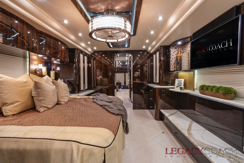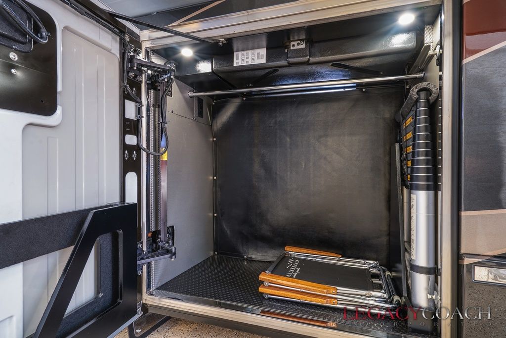 New arrival! This spectacular Millennium Quad Slide has to be seen fully to understand the level of care it’s received. This garaged coach shows “as new” from top to bottom and was serviced at Millennium Coach since new. Custom-built to exacting standards with many added features including multiple added storage areas, the finest finishes and fixtures, enlarged rear bath (vanity / shower) with open plan, mid-coach bath area lavatory (sink / toilet), heated floor throughout and so much more.